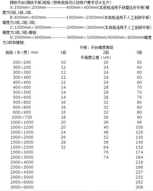 鑄鐵平臺按國家GB7947-1999標準制造.鑄鐵平板精度等級有0,1,2,3,級及精刨,鑄鐵平板制成筋板式和箱體式,工作面有長方形,正方形或圓形.工作面采用刮削工藝,工作面上可加工V形,T形,U形槽和圓孔,長孔等.